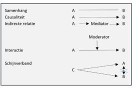 - De verwachte relaties tussen de variabelen. Indien variabelen elkaar wederzijds beïnvloeden spreken we van samenhang. In het conceptueel model wordt dit aangegeven door een lijn, of een dubbele pijl. Indien de er sprake is van causaliteit (de ene variabele beïnvloedt de andere, maar niet omgekeerd) wordt er een enkele pijl gebruikt.